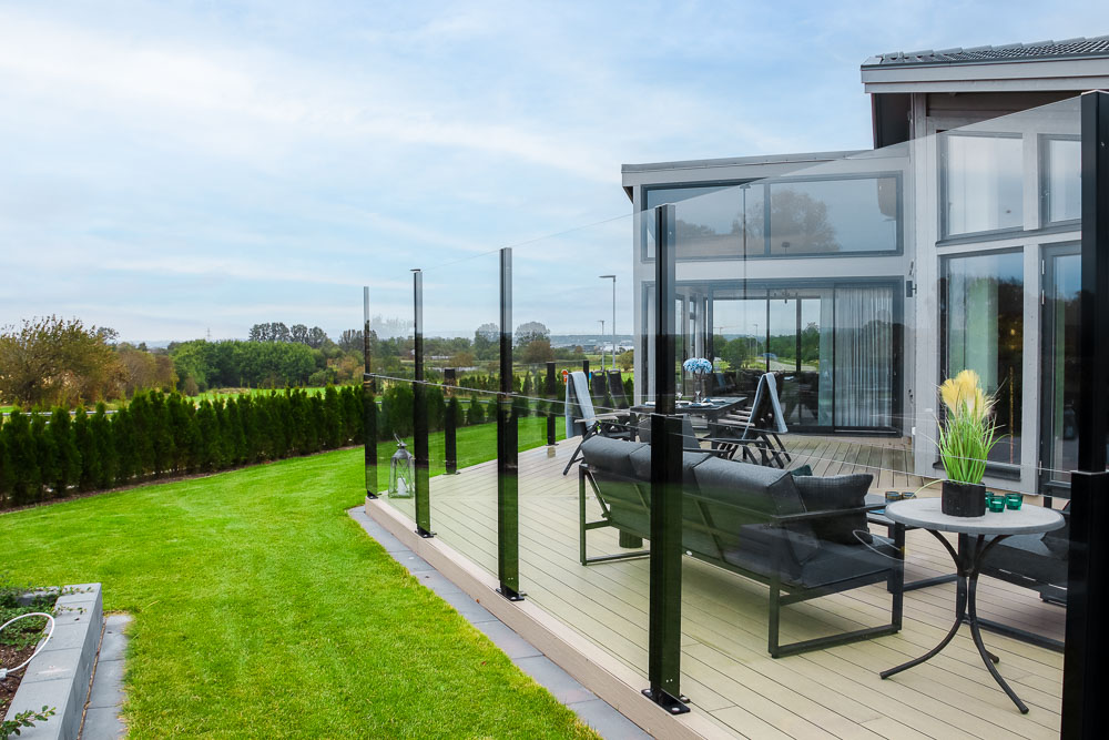 Barandilla de vidrio con función Flex que puede actualizarse con vidrio regulable en altura. La construcción está diseñada para instalación a nivel del suelo y permite pedir la parte móvil posteriormente.