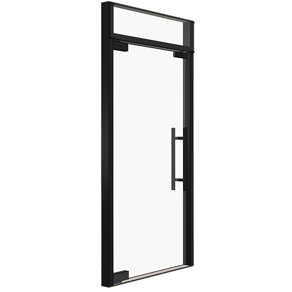 Puerta batiente acristalada con bisagras pivotantes y sobreluz integrado, diseñada para usarse junto con ClickitUpPlus.